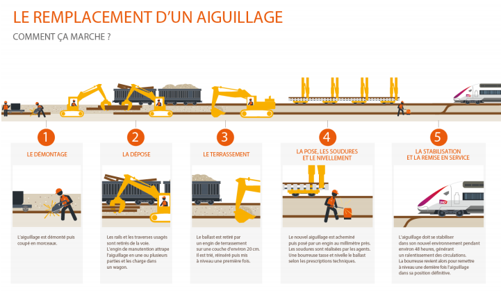 - SEMAINE 46 (du lundi 9 au vendredi 13 novembre) & WEEK-END des 28 & 29 novembre, les équipes de SNCF Réseau vont procéder au renouvellement d’appareils de voies, plus communément appelés aiguillages. Comment cela se déroule ce type d’opération ? Je vous propose de le découvrir au travers d’une infographie :