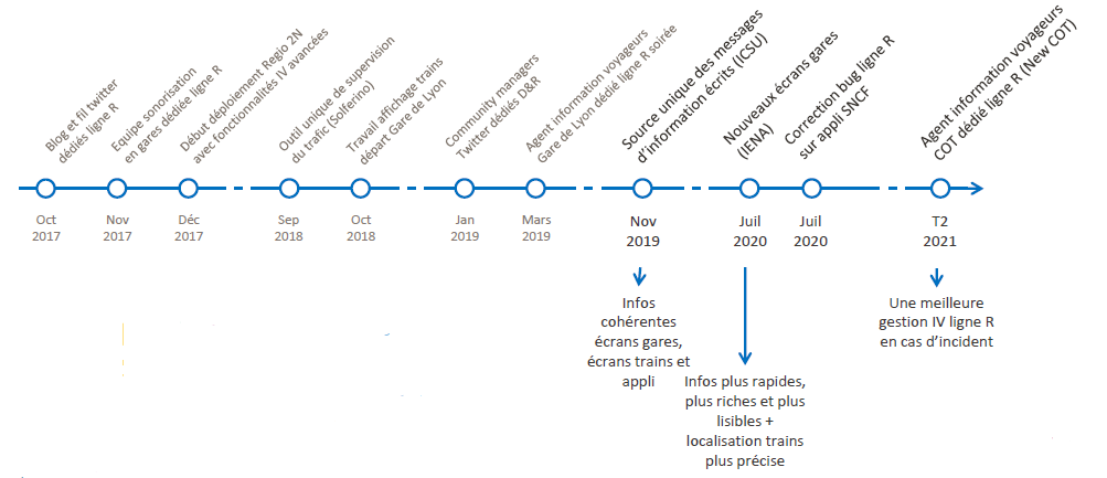 - À COURT TERME (pour 2021) : des ressources dédiées à la ligne R au Centre Opérationnel D&R ; des travaux sur les sites de maintenances avec un nouveau site de maintenance à Corbeil, qui bénéficiera aussi par ricochet à la ligne R ; un renfort de nos capacités de maintenance curative en cas de panne ou de choc sur les trains ; sur le Regio2N poursuite de la montée en compétence des conducteurs et mainteneurs ; poursuite de l’amélioration de la conception horaire pour éviter les congestions ; poursuite des travaux de maintenance des infrastructures…